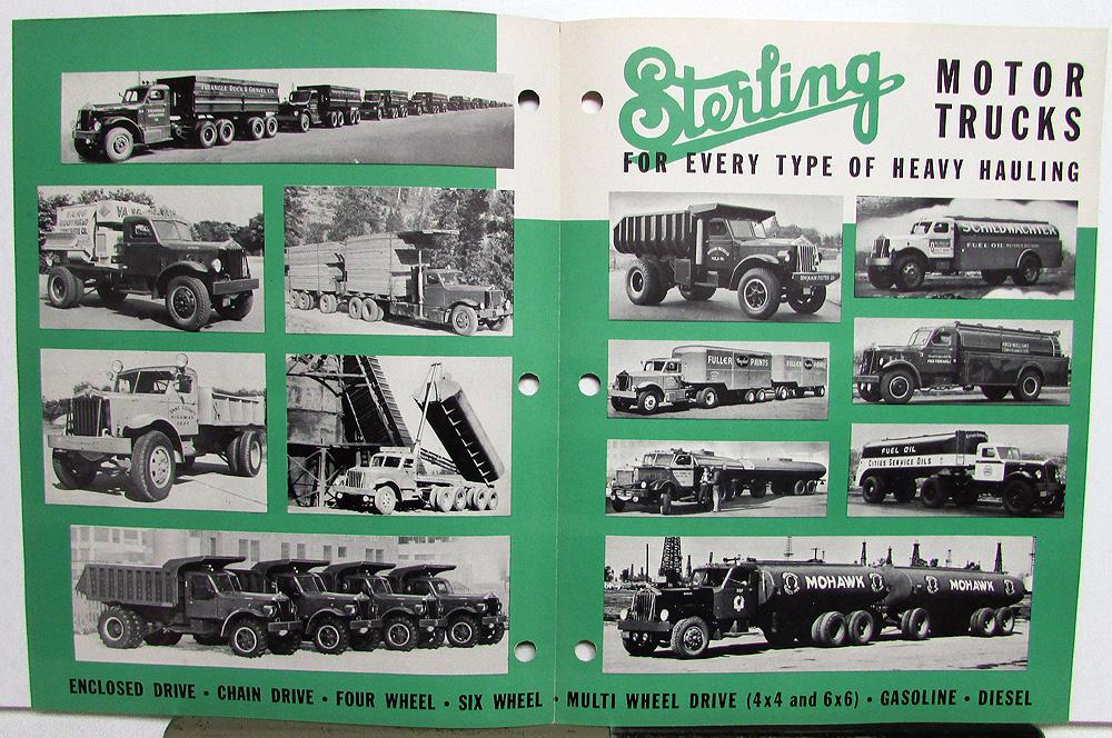 Original 1949 Sterling Trucks Dealer Sales Brochure. This well illustrated Folder highlights the many Heavy Hauling Options for Sterling Truck Models. It is in good condition with minor wear, discoloration and spine is hole punched for a binder [see photos].