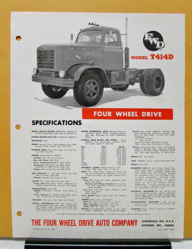 1950-1955 FWD Truck Model T414D Specification Sheet.