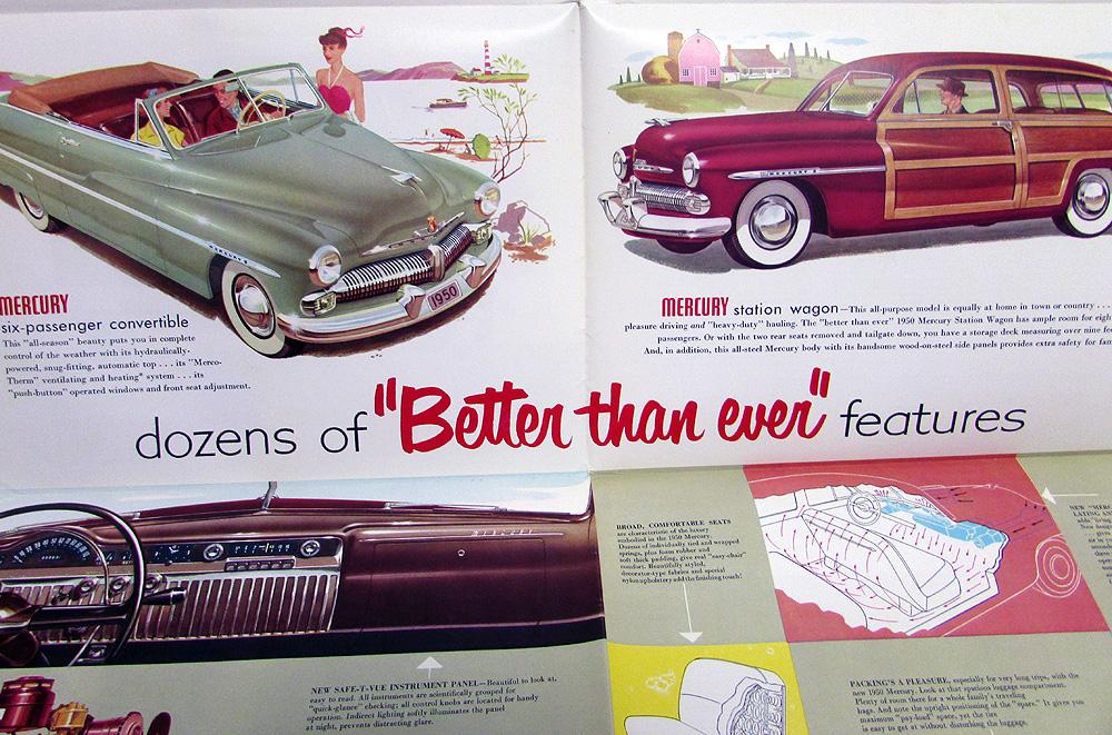 1950 Mercury, OCM Series, original, sales folder, with color printing on both sides of one-piece of paper with multiple folds. When opened it measures 22 x 25.25 inches. Color illustrations of the Models: sport sedan, six-passenger convertible, station wagon, and six-passenger coupe. Includes specifications and other colorful illustrations. Good condition for its age with minor wear and soiling [see photos].