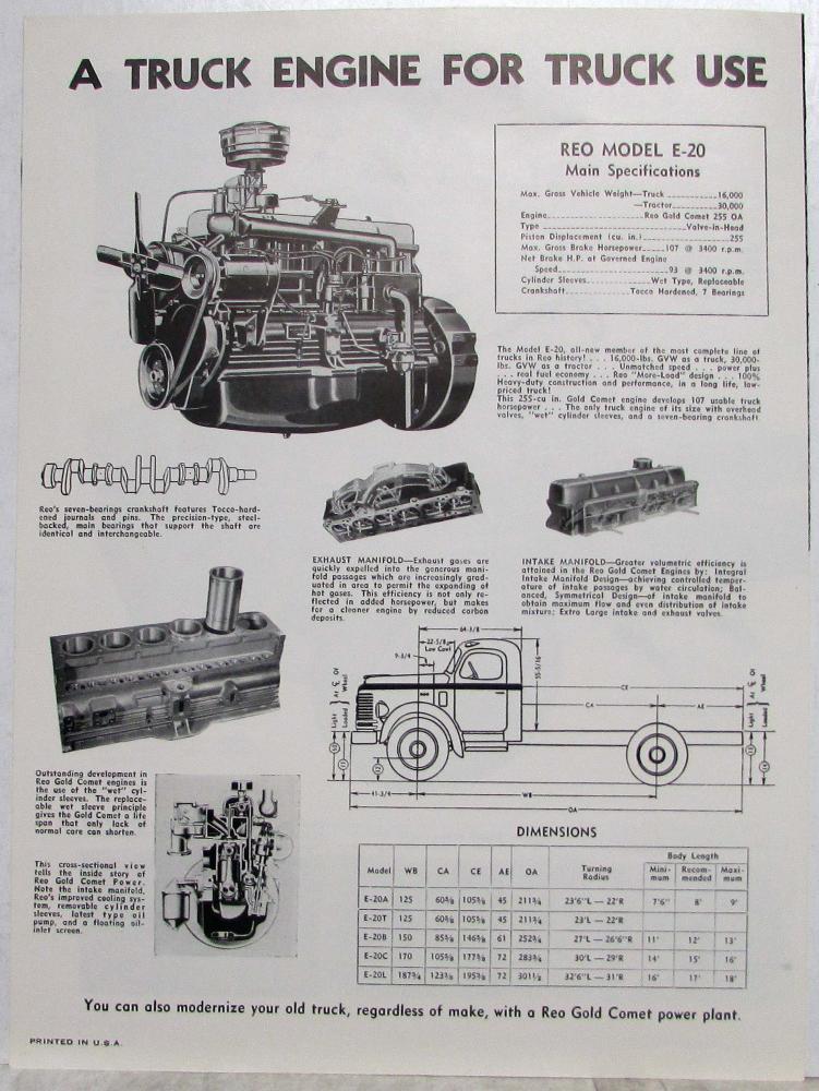 1950 REO E-20 Truck with Gold Comet Engine Sales Brochure. Original.