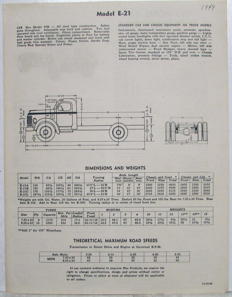 1950 REO E-21 Model Truck with Gold Comet Engine Specifications Sheet. Original.