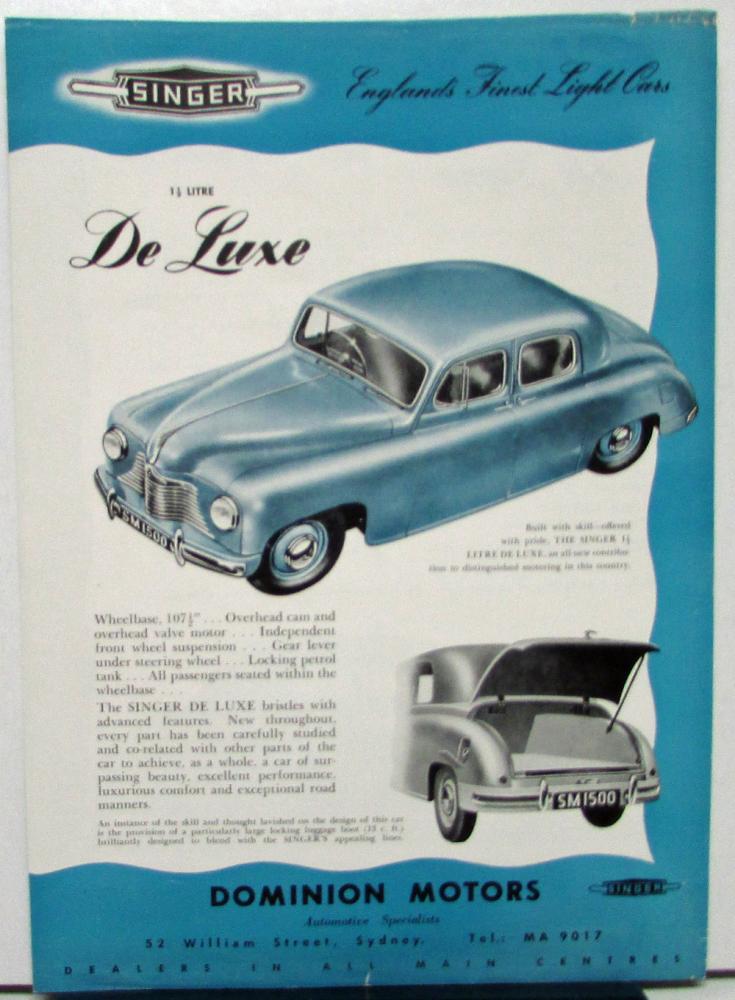 Original, two-sided printing on one sheet of paper for the Singer 1 1/2 Litre De Luxe car. Highlights and brief specifications on side two. Printed for Australian car market. Not sure of year of the make/model. Good condition. Edges have a few worn spots.