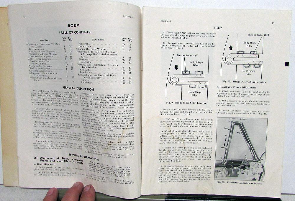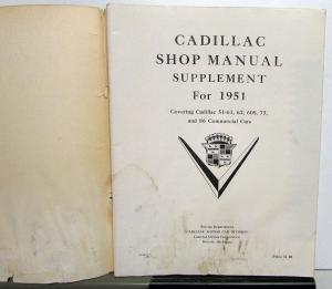 Original Cadillac (Service) Shop Manual Supplement for 1951. Covering Cadillac 51-61, 62, 60S, 75, and 86 Commercial Cars. It has updates and any new information or procedures pertaining to the 1951 Models and was meant to be used with the 1950 Shop Manual [not included] for full coverage. Covers: body, frame, suspension, brakes, engine, clutch, transmission, fuel, exhaust, steering, wheels/tires, chassis, electrical, radiator, lubrication, etc. It is in fair condition. It has been damp and shows some wear, soiling and blemishing [see photos]. The staples have rusted away, so the cover and staples have rusted away. Very rare and informative piece of automotive history.