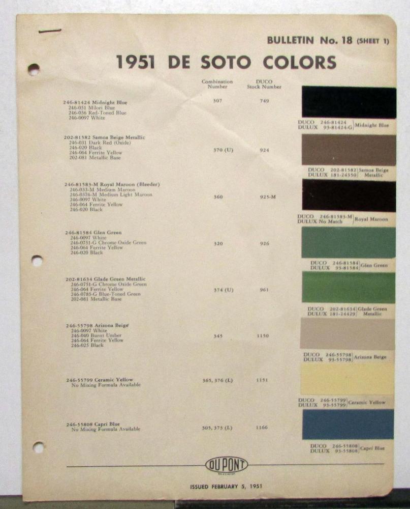 This is an original DuPont color bulletin that features the 1951 DeSoto model's paint chips. It is in good condition, however, does have some signs of wear, it is stapled, etc, see photos for reference. This is a great piece of history and a must-have for any automotive enthusiast!