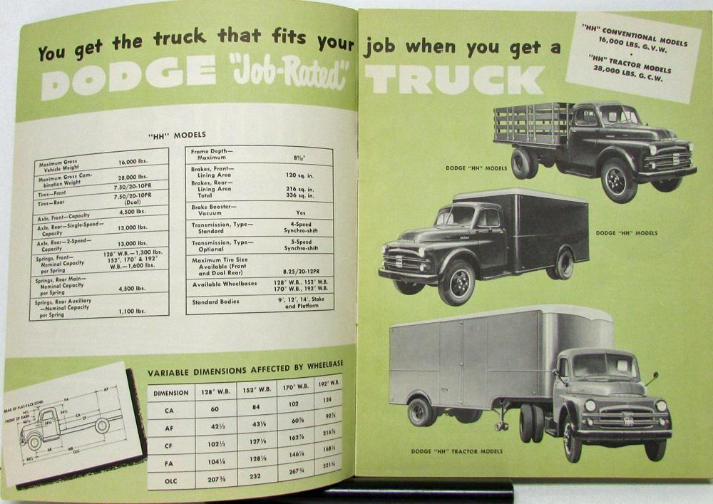 Original 1951 Dodge "HH" Models 2-ton trucks illustrated (stake, platform, cab-over-engine), sales brochure. Read about features, engines, chassis, dimensions, Pilot-House Cabs, and specifications and more. Front cover is slightly soiled in the lower right corner, staples have a little oxidation, otherwise very good condition.