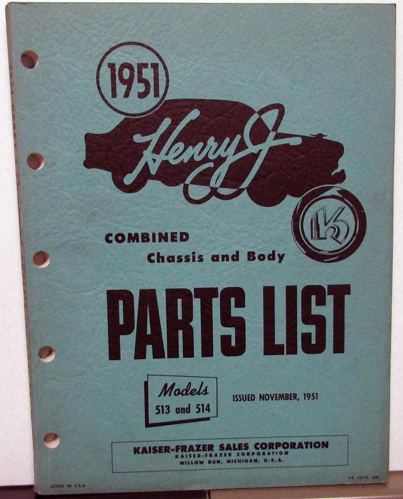 Original 1951 Kaiser-Frazer Henry J Dealer Chassis & Body Parts List. This Parts Book was issued November, 1951. It shows the Group #, Part Name, Description, Part Number, Application and Quantity of the Factory Replacement Parts that were available to service and repair your Model 513 or 514. It has illustrations & Diagrams of many of the Parts. It is in good condition with minor wear and soiling.