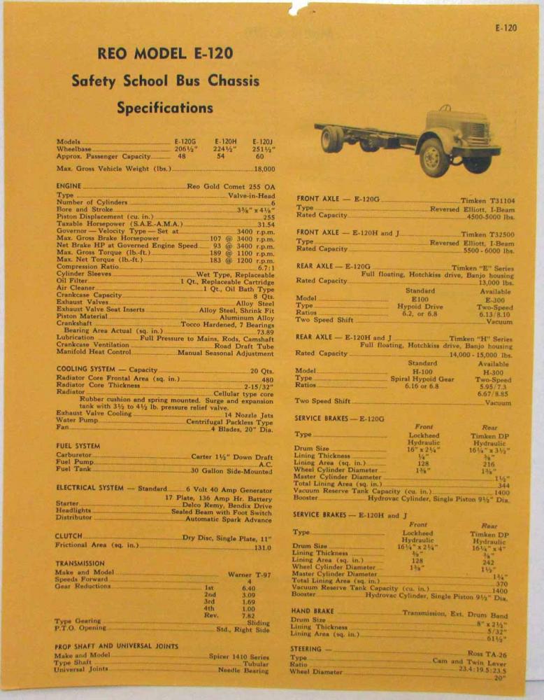 1951 REO E-120 121 & 122 Safety School Bus Chassis Spec Sheets. Condition: Pin hole and notch out of middle top. See pics.