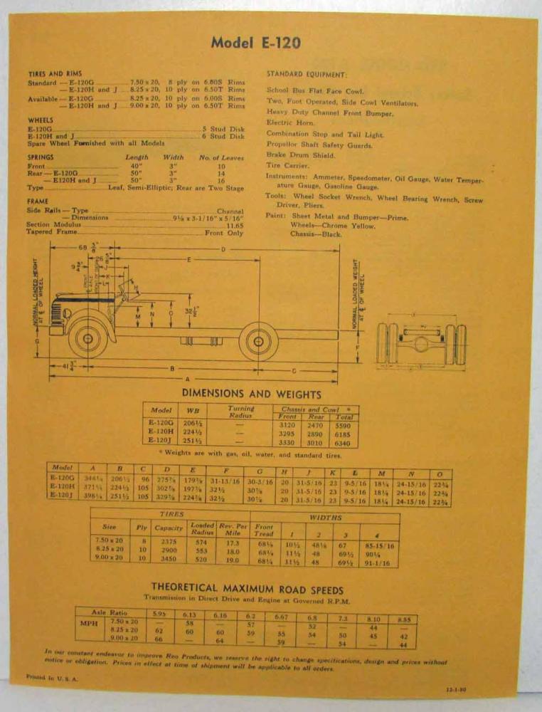 1951 REO E-120 Safety School Bus Chassis Spec Sheet.