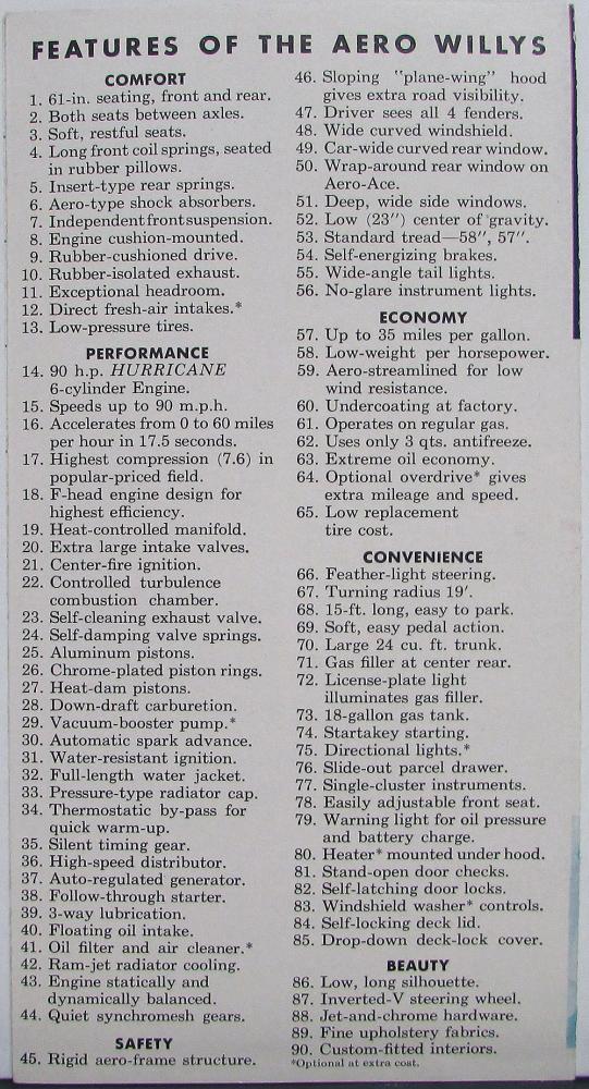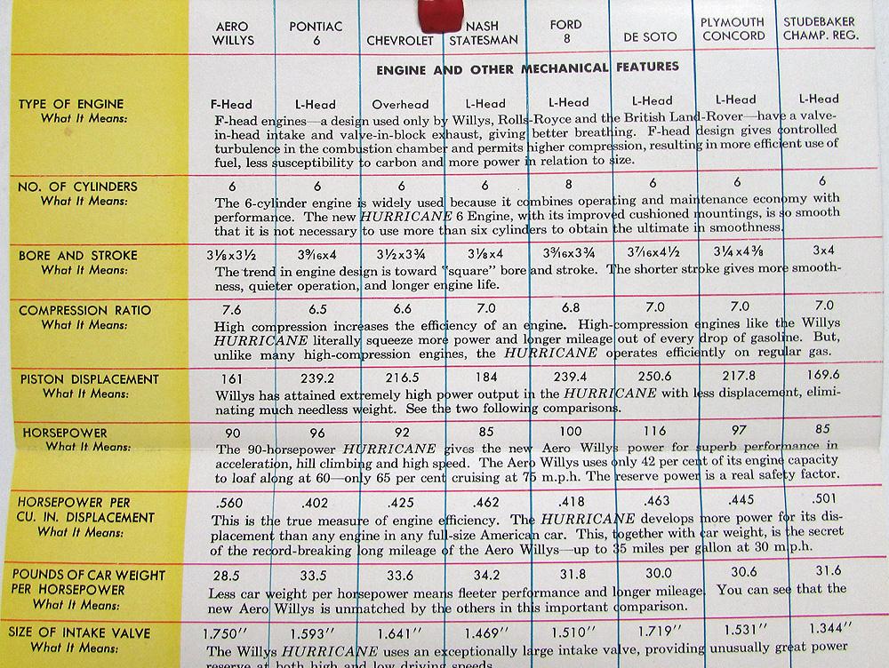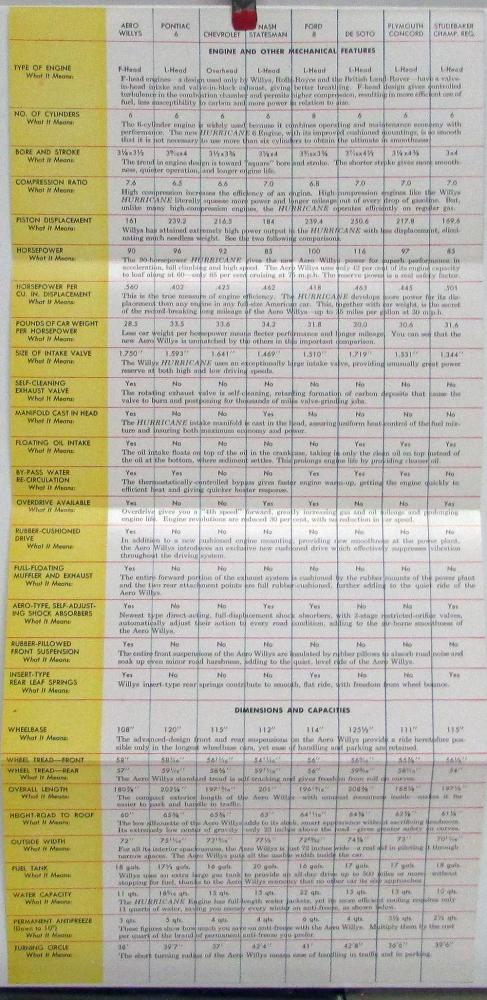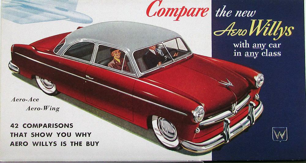 1952 Willys Aero-Ace & Aero-Wing "Compare The New" Sales Brochure. The brochure compares the Areo-Ace and Aero-Wing to the following makes/models: Pontiac 6, Chevrolet, Nash Statesman, Ford 8, De Soto, Plymouth Concord, and Studebaker Champion. Very good condition.