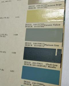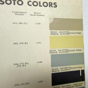 1952 DeSoto Dupont Paint Chips. Bulletin No. 19, Sheets 1-3. Paint Chips, Limited Colors, and 1946-1951 DeSoto Color codes on back. Condition: Some soiling of pages. Small piece missing on lower left cornr of sheet 3. Stamp on back of each sheet. Arizona Beige and Dusk Gray Metallic have pieces out of them. See pics.