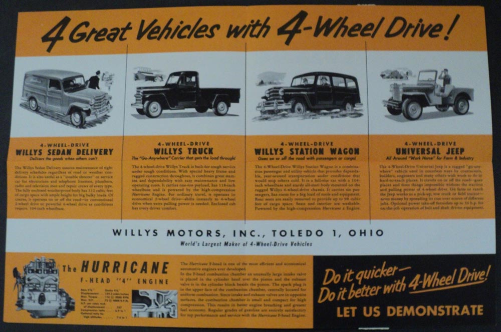 1952 4 great vehicles with 4-Wheel Drive (Willlys-Overland-Jeep) original, dealer sales brochure. Showcasing the: 4-wheel drive Wills Sedan Delivery, 4-wheel drive Willys Truck, 4-wheel drive Willys Station Wagon, and 4-wheel drive Universal Jeep. No specifications. Measures 5.5 x 8.5 with 8 pages/panels.