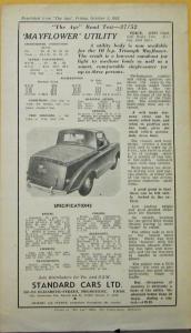 Original, 1952 Standard Mayflower Car (British Cars) color, sales folder printed in England. Two-sided printing on one sheet of paper with two folds. Includes specifications, interior photos, and features. Very good condition.