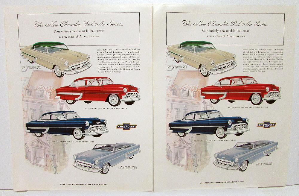 Original Pair of 1953 Chevrolet Bel Air Magazine Ad Slicks. These large advertising Proofs were sent to Magazines for publishing ads. They are in very good condition with minor discoloration. These will make a great framed display item.