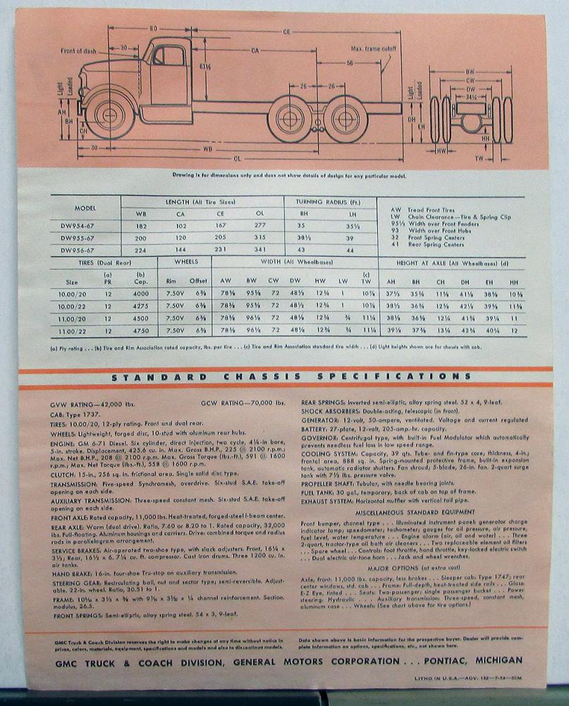 Original sales datasheet printed doubled sideded on one sheet of paper. Covers the DW 950-67 diesel powered GMC trucks. Dimensions and standard chassis specifications. Printed in July, so it may cover both years 1954 and 1955. Good condition. Paper is wavy from storage. ADV 182--7-54