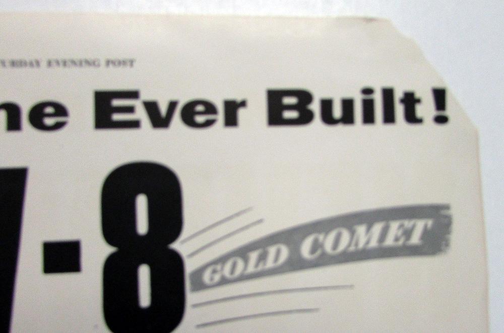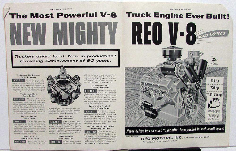 Original 1954 1955+ REO Truck V-8 Engine Dealer Sales Brochure. This large Folder is a Factory reprint of an ad from the Saturday Evening Post highlighting the New V-8 Truck Engines from REO. The front shows the cover from the Oct. 30, 1954 Saturday Evening Post. It is in good condition for its age with some wear, discoloration and blemishing [see photos]. Upper right corner has been torn. *Reprint from magazine issue Oct. 30, 1954, so could be ad for the 1955 engine model.