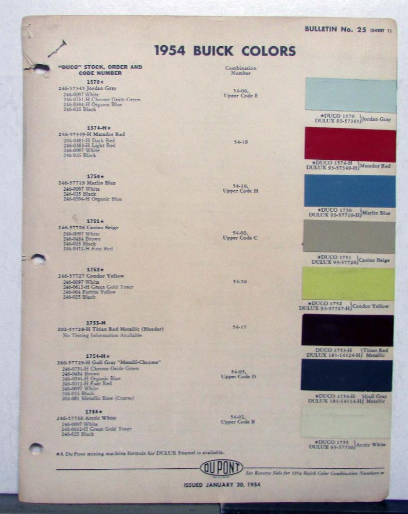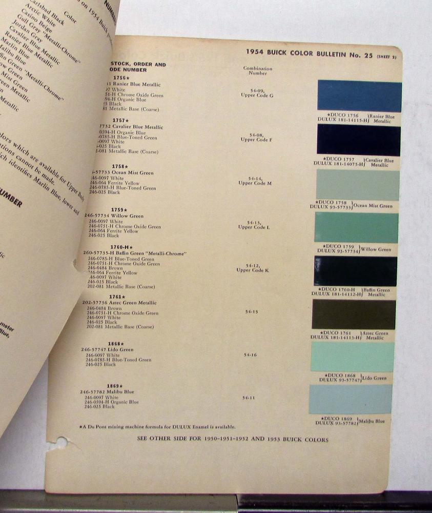This is an original DuPont color bulletin No 25 that features the 1954 Buick paint chips. It is in good condition, however, does have some signs of wear, stapled, etc, see photos for reference. This is a great piece of history and a must-have for any automotive enthusiast!