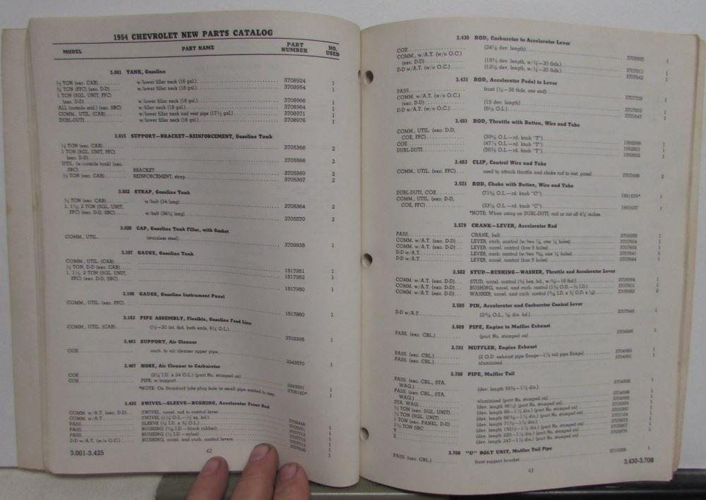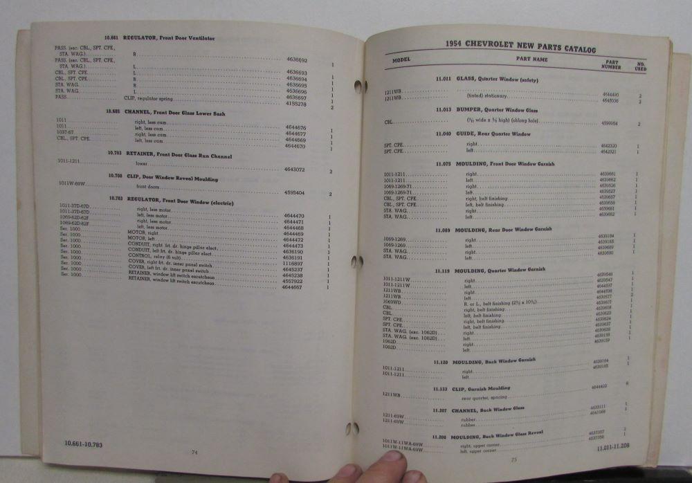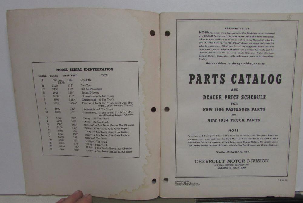 Original 1954 Chevrolet New Car and Truck Parts Catalog and Dealer Price Schedule [dated effective December 10, 1953]. This Parts Book covers all the Factory Parts that are new for the 1954 Models. Any Parts that were the same as the previous year would be covered in the 1953 Parts Book [not included]. It has Part Numbers, Description, Application and Illustrations for these New Parts. The back of Catalog has the Dealer Price Schedule. This hard to find and informative book is in good used condition with minor wear and soiling [see photos]. Release No. 53-12A