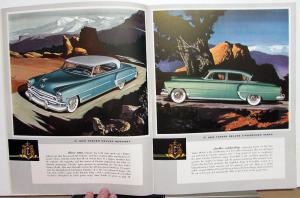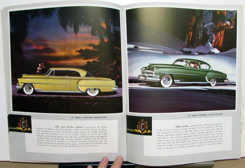 The Beautiful Chrysler New Yorker (NY) and New Yorker Deluxe (NYD) Models, ORIGINAL, Prestige dealer, color sales brochure. Colorful illustration. Read about interiors of suberb styling, comfort, convenience & safety, two fire power V8 engines of unexcelled efficiency, mechanical features, and specifications. Cars illustrated are: NYD Newport, NYD 6-Passenger Sedan, NYD Club Coupe, NYD Convertible Coupe, NYD, NY 6-Passenger Sedan, NY Newport, NY Club Coupe, NY 8-Passenger Sedan, and NY Town & Country Wagon. Very good condition with minor wear and soiling [see photos].