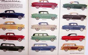 Original, sales folder, promoting the Ford Mainline, Customline, and Crestline cars. Review information on the engines, features and chassis, and colorful illustrations of the 14 styles offered. Two-sided printing on one sheet of paper with two folds. Good condition minor wear, discoloration and front cover has a Dealer Stamp [see photos].