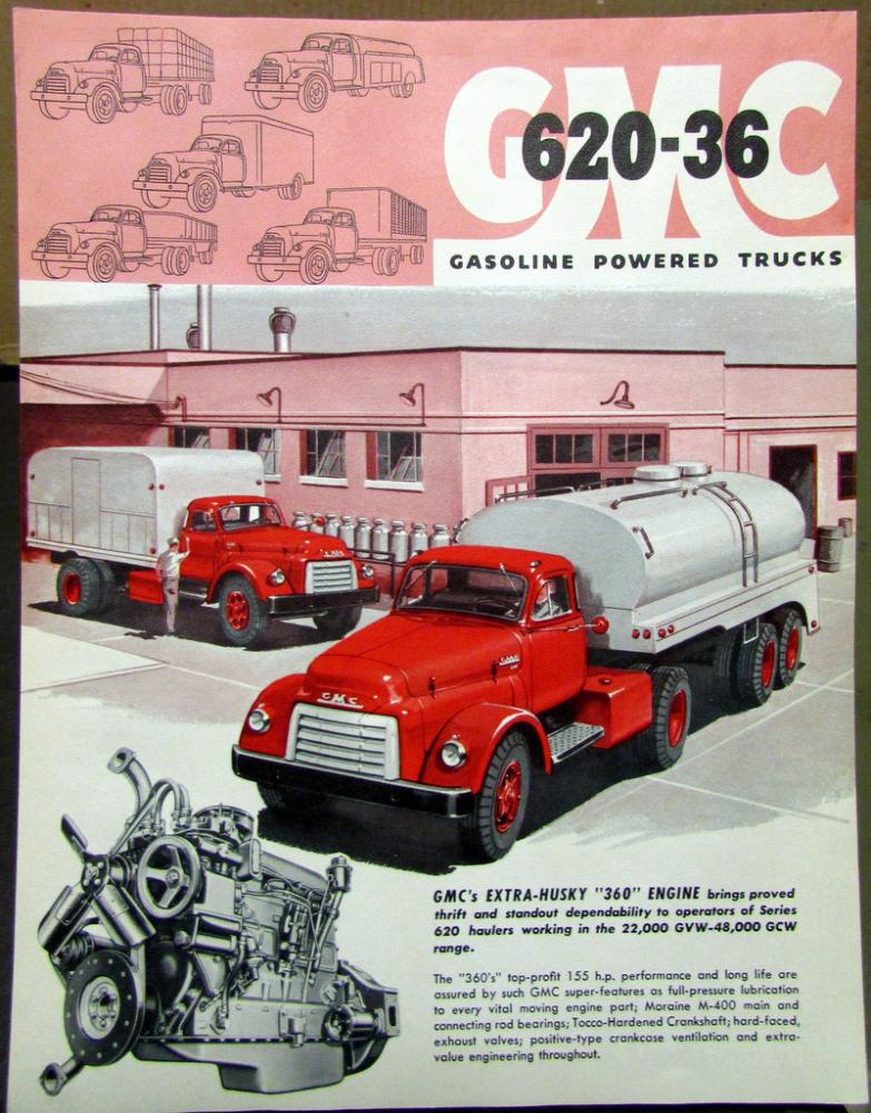 Original, 1954 datasheet for the GMC gasoline-powered trucks, model 620-36 with illustration(s); dimensions, and standard chassis specifications. One sheet with printing on both sides. Good clean condition. ADV 167--10-53