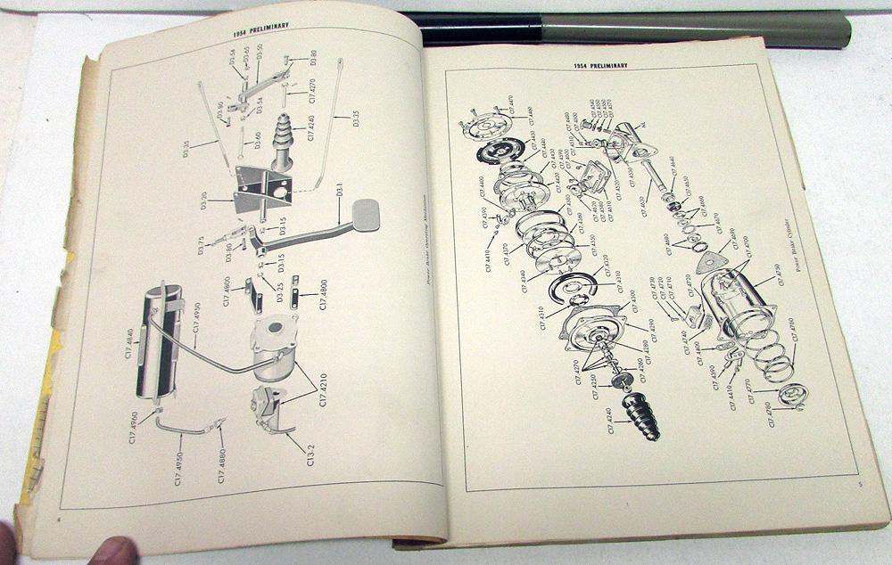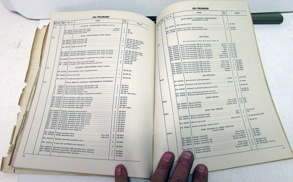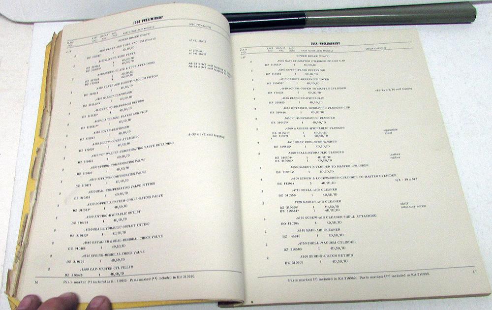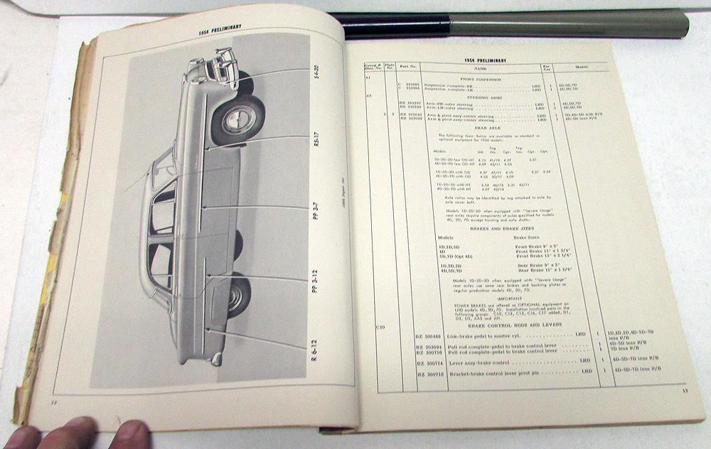 Original 1954 Hudson Dealer Preliminary Group Parts Book. This Dealer Parts Catalog has Part Numbers, Description, Quantity, Aplication and some Illustrations for Parts that were available from the Factory to repair or service your D Series Hudson Car. It has the new and non-interchangeable Parts for 1954 and was meant to be used with the 1953 Parts Book for Full Coverage. This is what the Hudson Dealer would use to order replacement Parts to repair your car. This hard to find Book will make a very useful tool for the Hudson Owner or Collector. It is in good condition for its age with normal wear, blemishing and soiling from use in a Dealership [see photos].