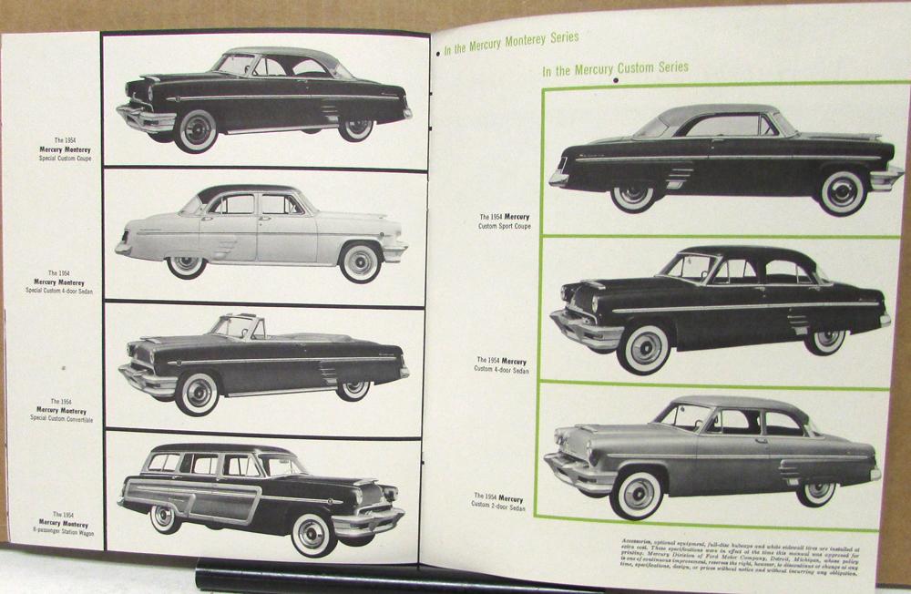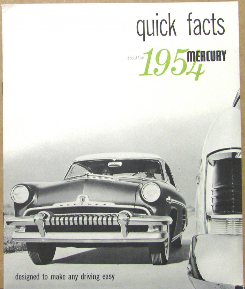 Original sales brochure, in B/W, Quick Facts about the 1954 Mercury designed to make any driving easy. Read about and look at photos and illustrations on the suspension, transmission, styling, steel body, Monterey Sun Valley transparent top car, power features, and photos of the Monterey lineup and the Custom lineup.