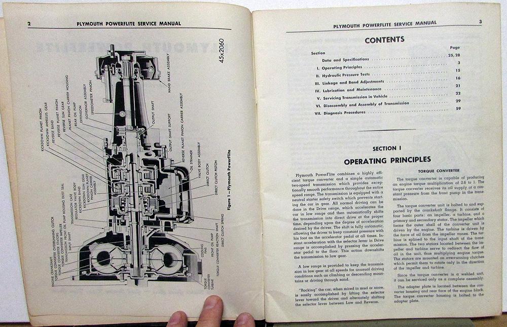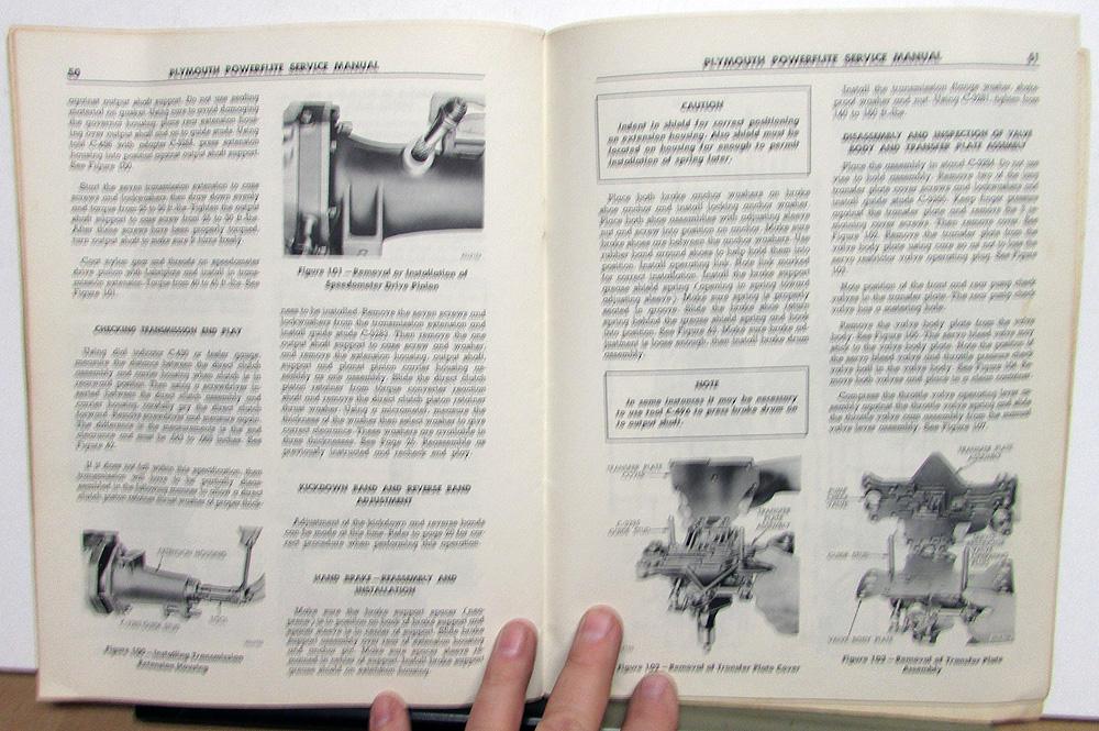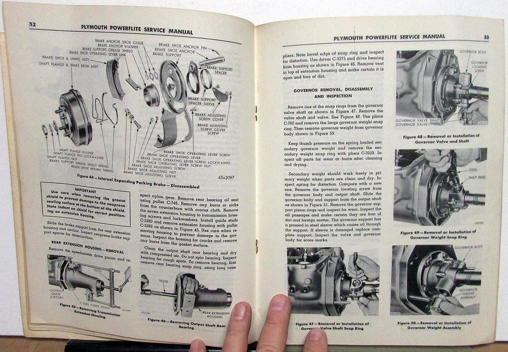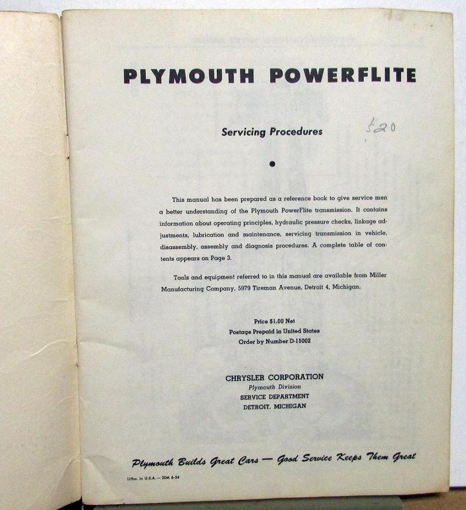 Original 1953 Plymouth Dealer Service Manual. This Shop Manual covers the PowerFlite Transmission in Plymouth Cars. This is what the Dealer used to service and repair the Transmission in your car. It is in good condition with normal wear and blemishing from use in a Dealership [see photos].