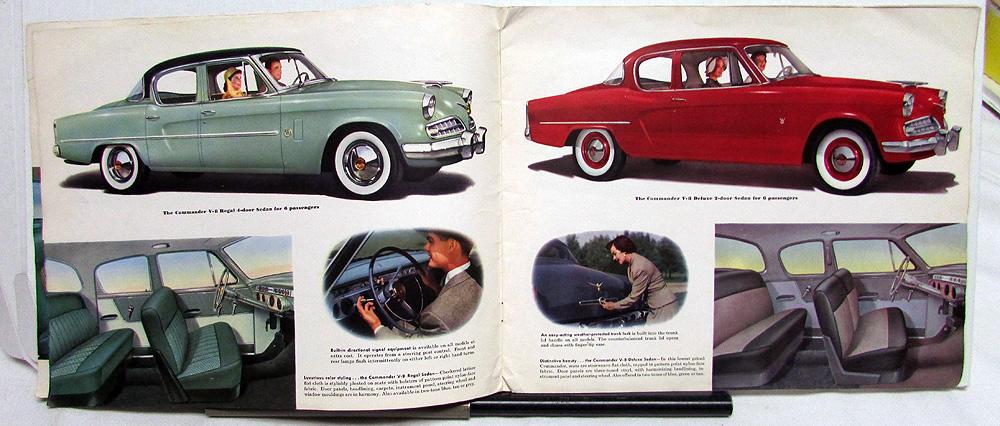 Original, Studebaker 1954 Dealer color, extra large, sales brochure features the Commander V8, Champion, Land Cruiser models. Colorful photos of cars, features, equipment, all with captions. Includes specifications. This rare very large Brochure is in fair condition with some wear, soiling and blemishing [see photos].