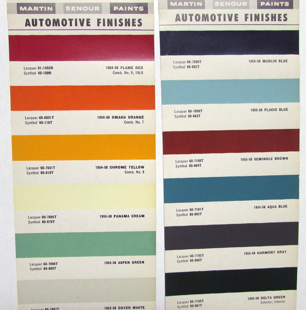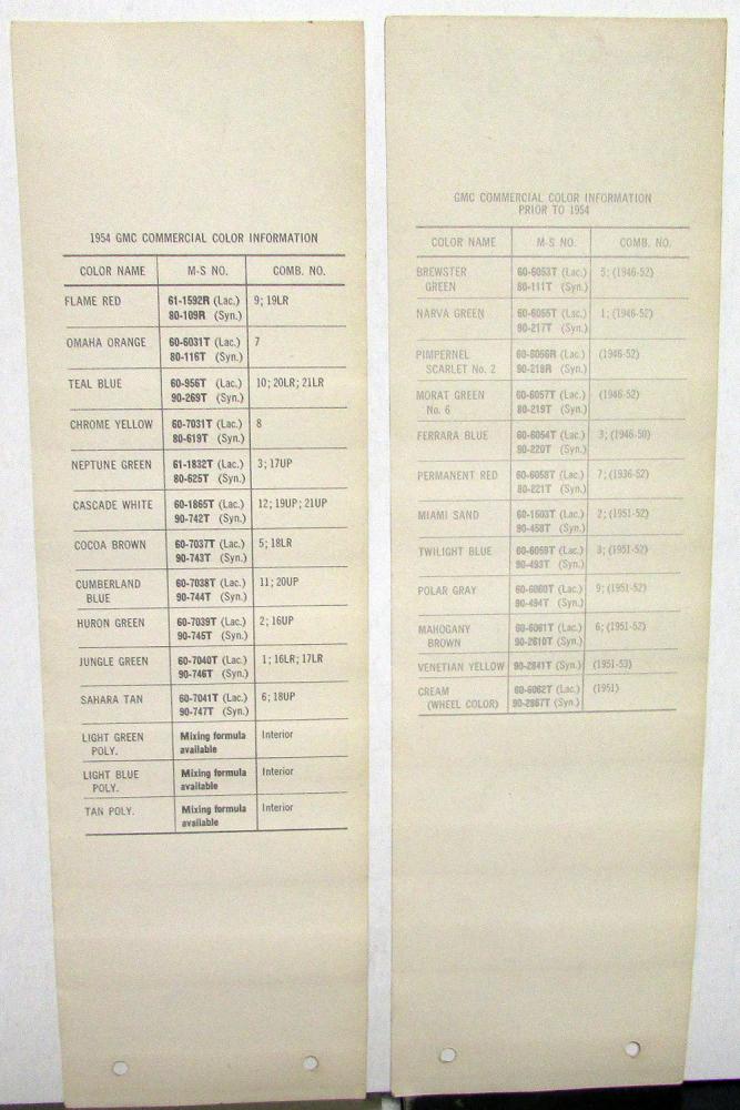 Original 1955-58 GMC Martin Senour Paints Color Paint Chips. These 2 Leaflets highlight the Exterior Color Options for the GMC Truck Models. They are in good condition with minor wear and soiling [see photos].