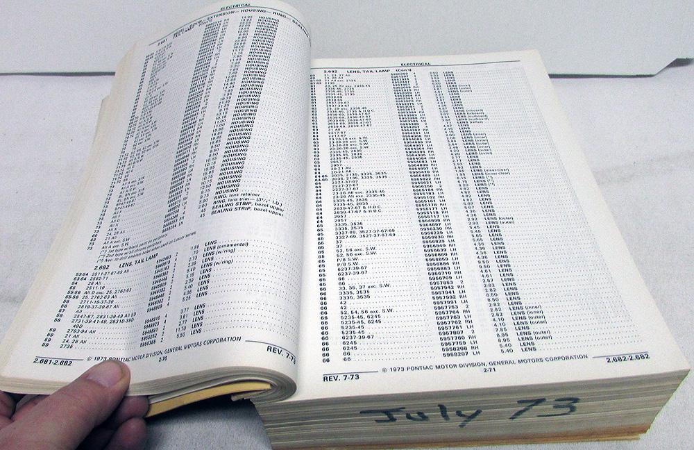 Original 1955-73 Pontiac Dealer Parts and Accessories Catalogue, dated effective July, 1973. This Body & Chassis Parts Book is what Dealers used to order available Factory Replacement Parts to repair your Car. It shows Part Numbers, Description, Application, Quantity, List Price and some Illustrations for the Replacement Parts that were available for 1955-73 Pontiac Cars as of the Print Date. Parts Book is in good condition for its age with minor wear, soiling and blemishing [see photos]. Loose leaf pages with no Binder. Very informative and hard to find tool for the Pontiac Owner or Enthusiast.