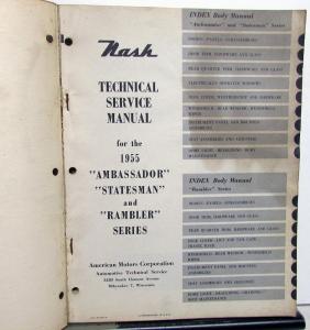 Original 1955 AMC Nash Dealer Body Service Manual. This Shop Manual is what the Dealer used to service and repair the Body on your Ambassador, Statesman or Rambler Series Car. It has information, specifications, troubleshooting, procedures and illustrations to aid in repairing and adjusting Body Parts on these cars.