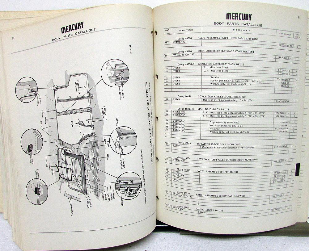Original 1955 Mercury Dealer Body Parts Catalog, [Final Edition, dated December 1955]. This Parts Book covers the Full Line of Mercury Models for this year. This is what the Dealer used to order available Factory Replacement Parts to Repair your Car. It has Part Numbers, Description, Application, Quantity and Illustrations. It is in very good condition for its age with minor wear, soiling and blemishing from use in a Dealership [see photos]. Very rare and informative piece for the Mercury Owner or Collector.