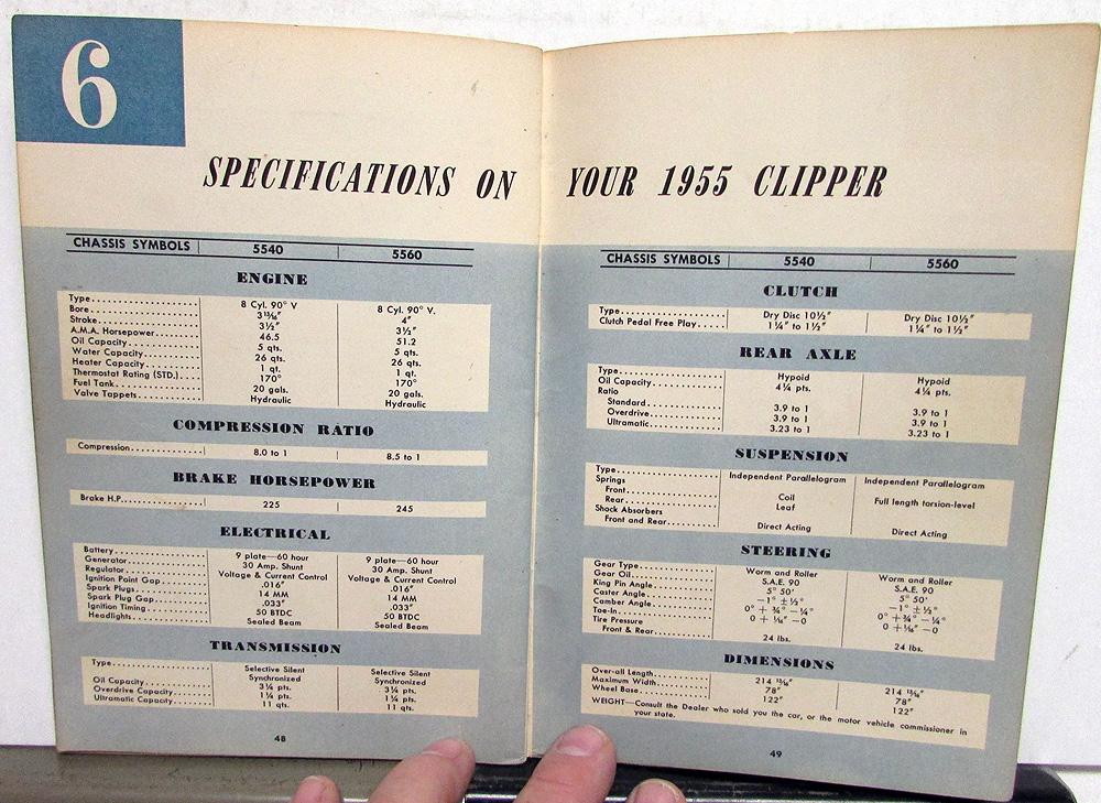 Original 1955 Packard Owners Manual. This Manual gives Care, Maintenance and Operation Instructions for the Packard Clipper Models. This Manual shows some wear, soiling and blemishing [see photos]. The cover has writing, blemishing and a sticker on it while the pages are pretty good with minor wear and discoloration.