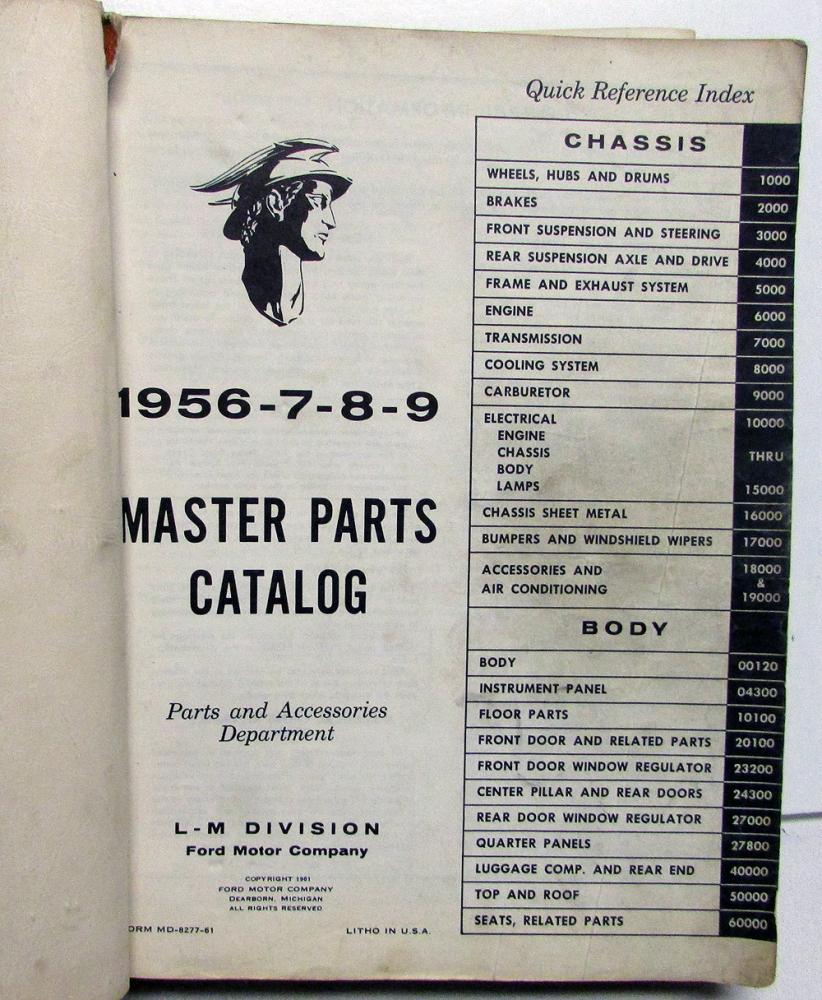 Original 1956-59 Mercury Dealer Master Chassis & Body Parts Catalog [dated Revised October 1961]. This Parts Book covers the Full Line of Mercury Models for these years. This is what the Dealer used to order available Factory Replacement Parts to Repair your Car. It has Part Numbers, Description, Application, Quantity and Illustrations. It is in good condition for its age showing some wear, soiling and blemishing from use in a Dealership [see photos]. Spine has been taped. Very rare and informative piece for the Mercury Owner or Collector.
