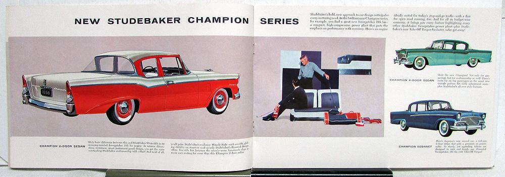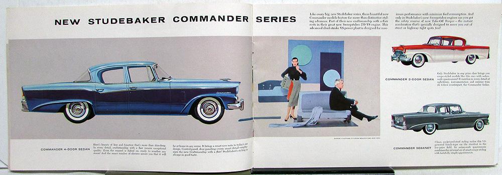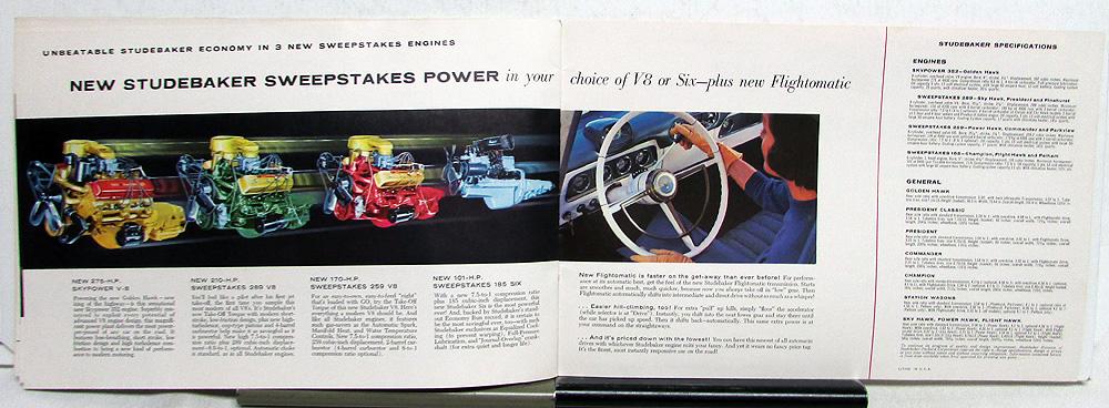 Original, color, sales brochure for 1956 Studebaker Presidents, Commanders, Champions, Hawks, and station wagons. Includes specifications. Colorful illustrations and photos. Good condition with minor wear and blemishing [see photos].