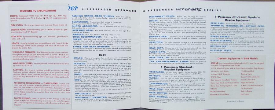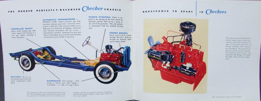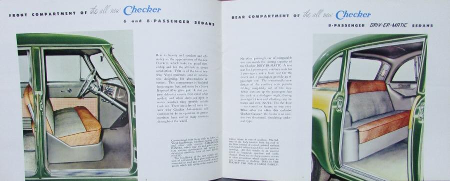 Original, 1957 1958? Checker automobiles featuring the 6-passenger standard and the 8-passenger DRIV-ER-MATIC Special Sedans. This is a REVISED color, sales brochure and printed on a textured paper with nice, sharp, color photos. Inset photos of features, interiors, dimensions, and complete specifications. NICE PIECE! There is a piece of paper stapled to the front cover indicating there are revisions. The revisions are on the features and specs pages. There is a date stamp on the back cover, lower right corner "Jul '57".