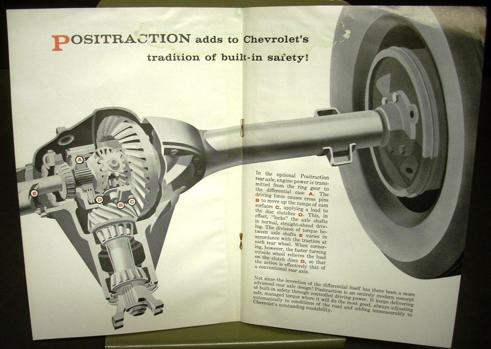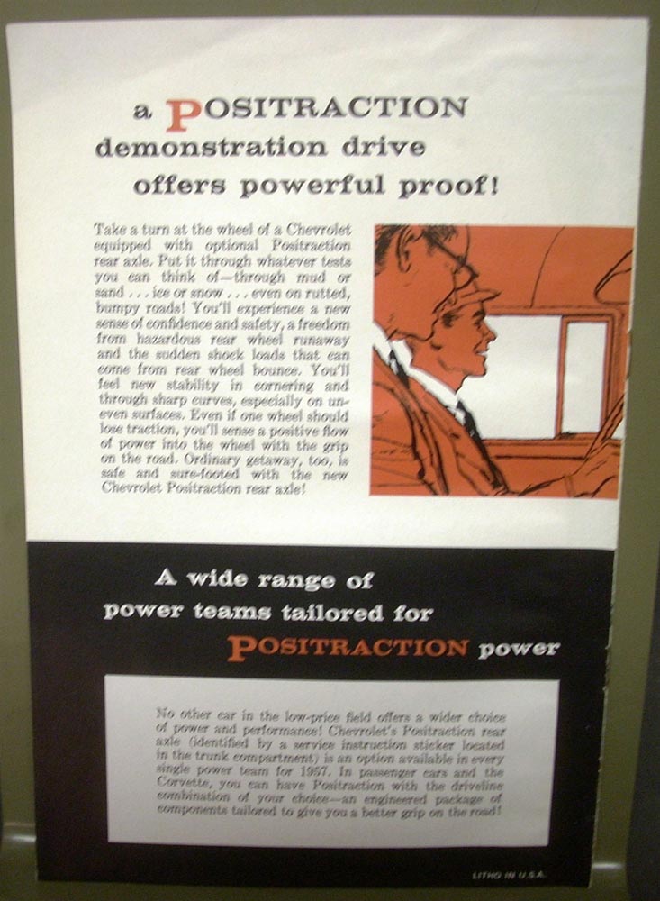 Good original 1957 Chevrolet Dealer Positraction Sales Brochure. It measures 6" X 9" and has 8 pages. Very informative Brochure on the benefits of having a Positraction Rear Axle in your new 57 Chevy. Very cool piece for Car Owner or Collector. Don't miss your chance at this very rare piece of automotive history. It will make a great display piece. It is in good condition for its age.