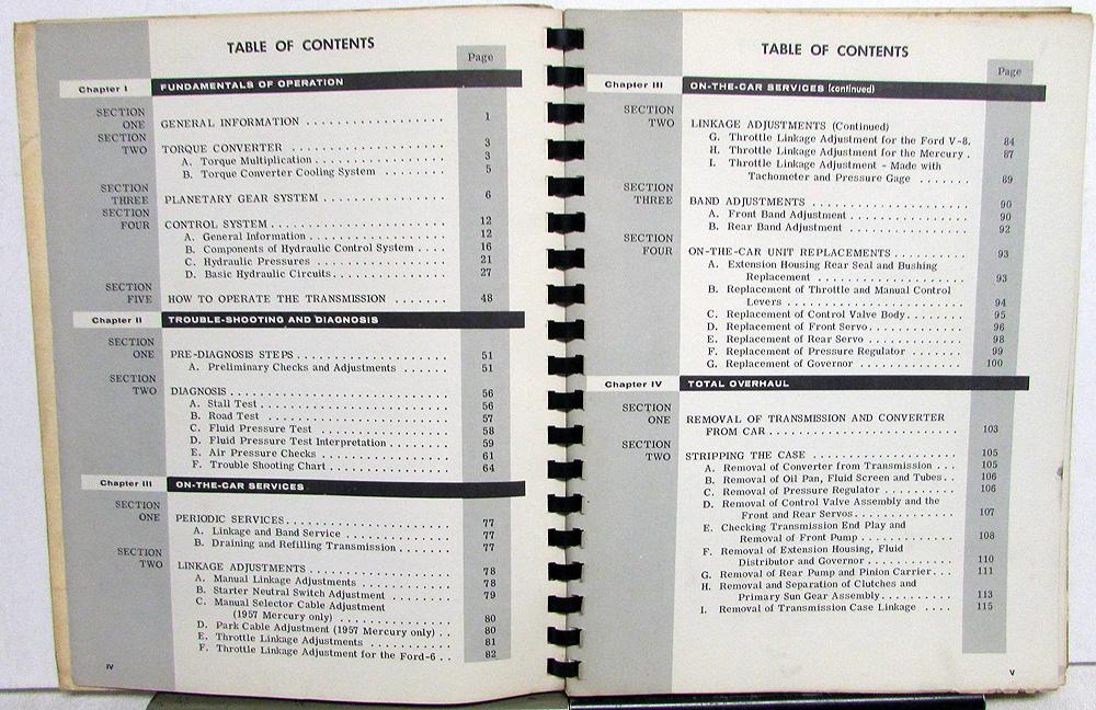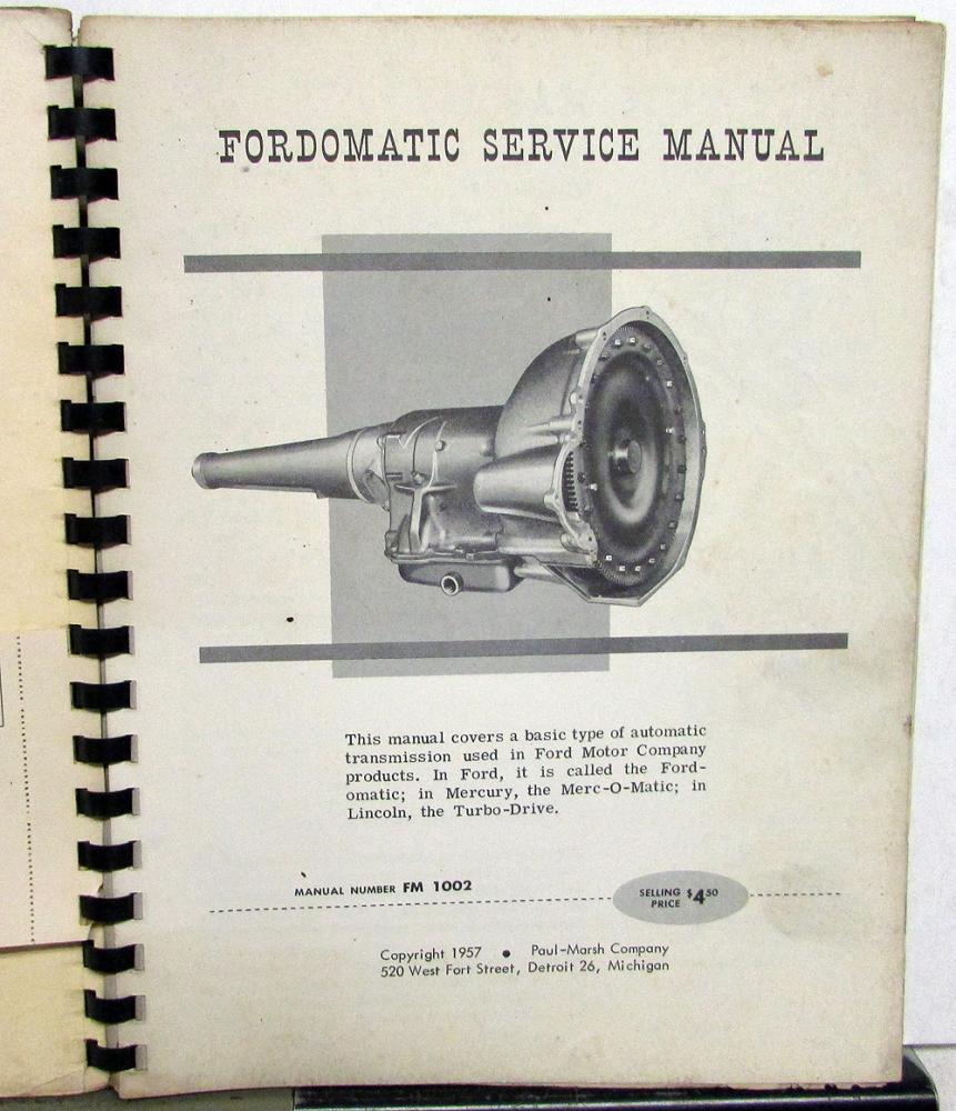 Original 1957 Paul Marsh Ford Transmissions Service Manual. This educational Shop Manual covers the Fordomatic, Merc-O-Matic and Lincoln Turbo-Drive Transmissions. This would be used by Mechanics to help them service and repair these Auto Transmissions. It is in good condition with some wear and soiling [see photos]. Very informative and useful tool for the Ford Owner or Collector.