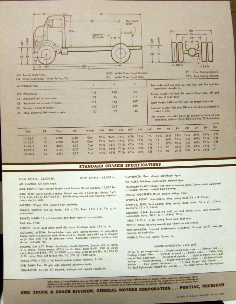 Original, 1957, GMC truck DF 860 series, data sheet printed on both sides of one sheet of paper. Includes illustrations, dimensions, and standard chassis specifications. ADV321--11-56