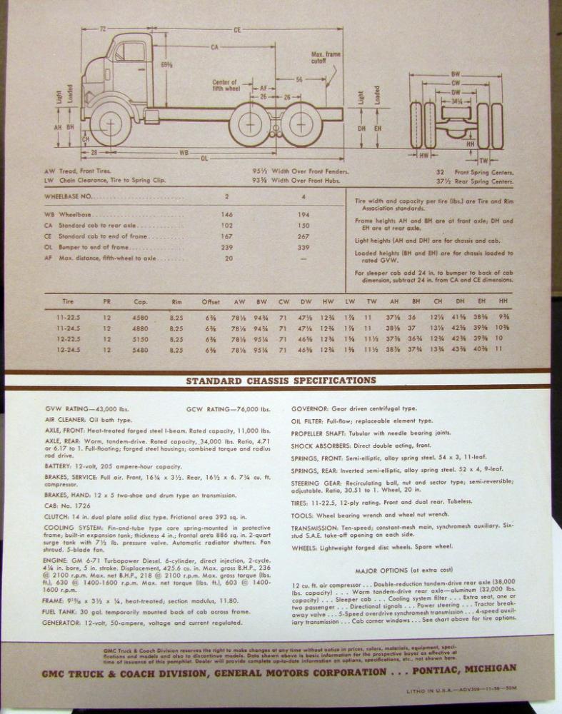 Original, 1957, GMC truck DFW 950 series, data sheet (sales brochure) printed on both sides of one sheet of paper. Includes illustrations, dimensions, and standard chassis specifications.