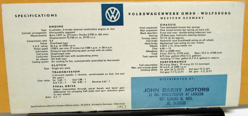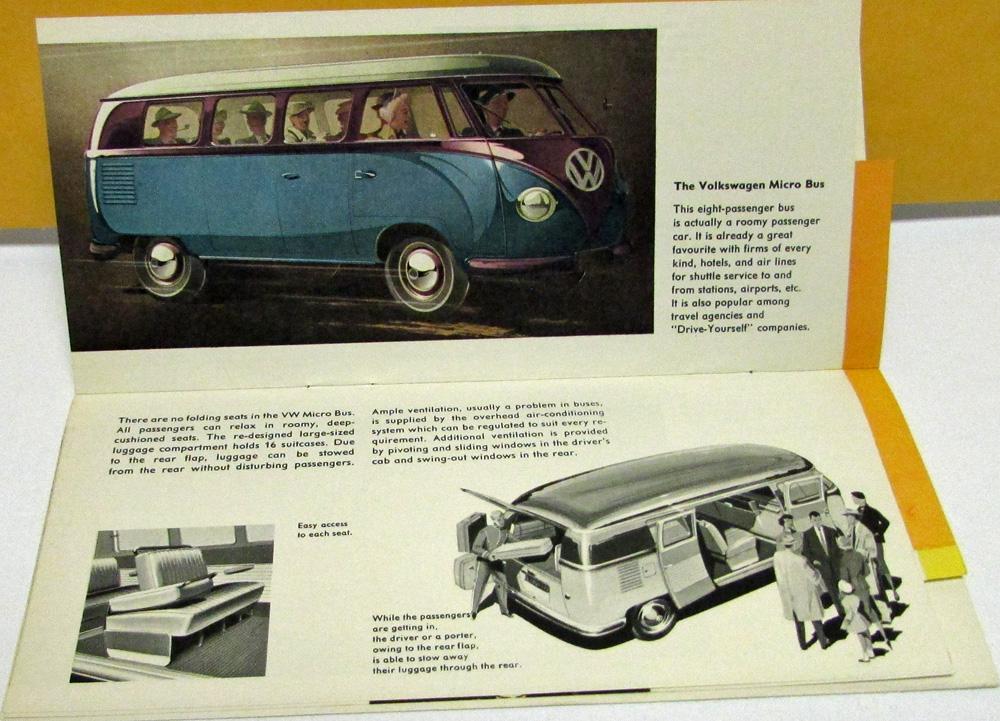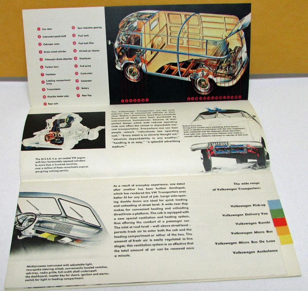 Original 1957 VW Dealer Sales Brochure. This well illustrated Brochure highlights the Transporter Models. It is in good condition with minor wear and soiling. Very rare and informative piece of automotive history that will display well.