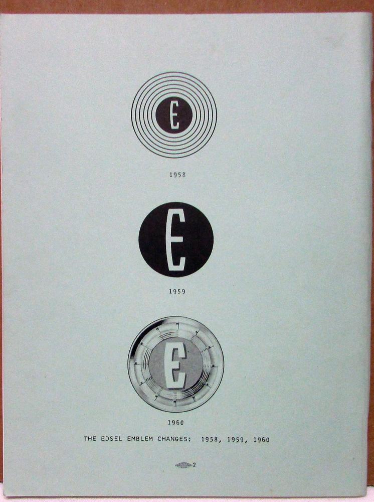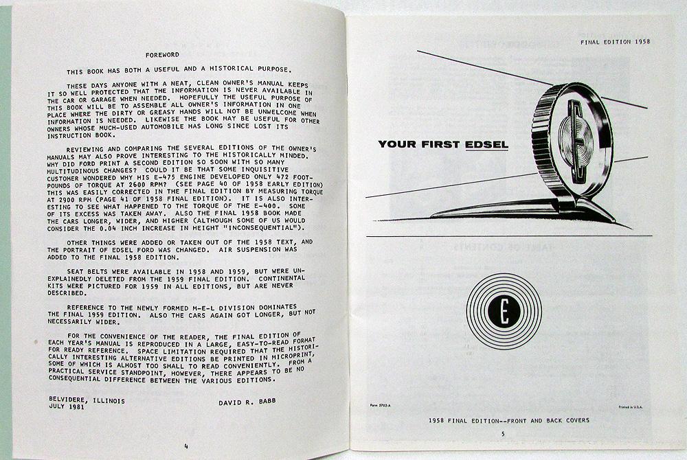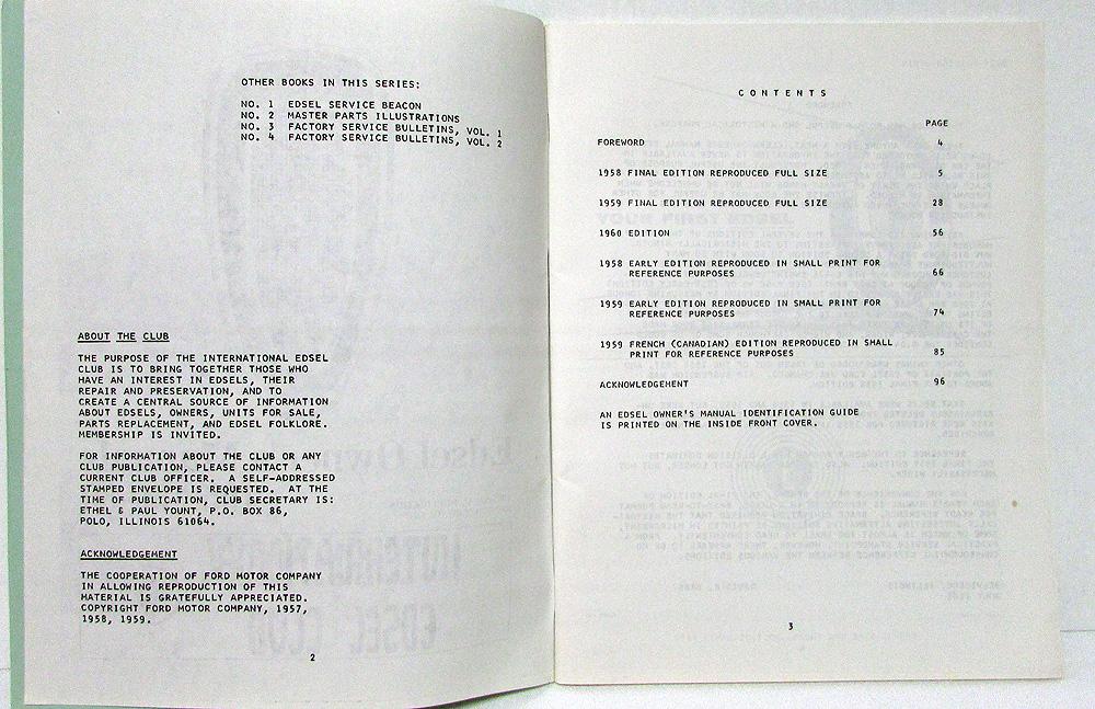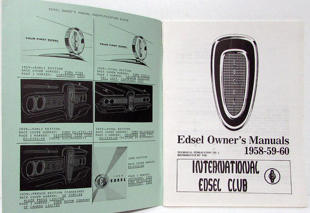 Edsel Owner's Manuals 1958-1959-1960, Technical Publication No. 5, reproduced by the International Edsel Club. This book was compiled with information as a source of information about Edsels, owners, units for sale, parts replacement, and folklore. Contains 58 final edition owners manual full size photocopied, 59 final edition owners manual full size photocopies, 60 edtion, 58 early edition reprodcued in smal print for reference purposes, 59 French (Canadian) edition reproduced in small print for reference purposes. Owner's manual identification guide is printed on the inside front cover. Very good condition.