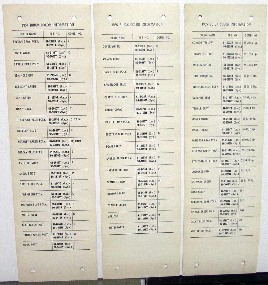 Original 1958 Buick Martin Senour Paints Color Paint Chips. These 3 Leaflets highlight the Exterior Color Options for the Buick Passenger Car Models. They are in good condition with minor wear and soiling [see photos].