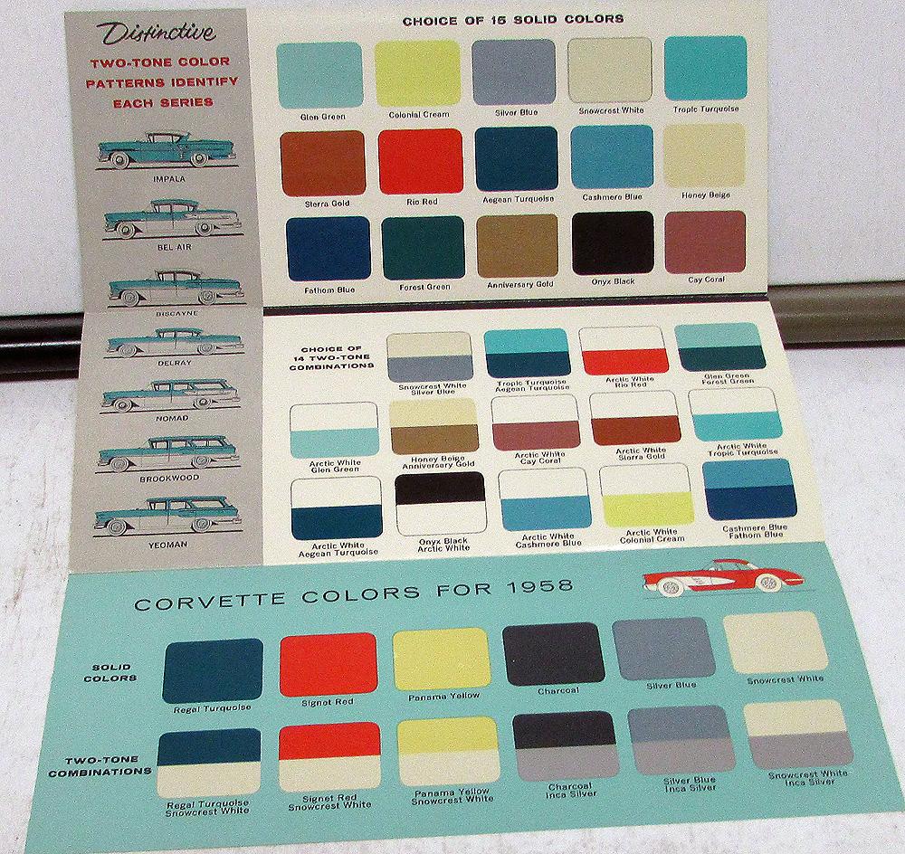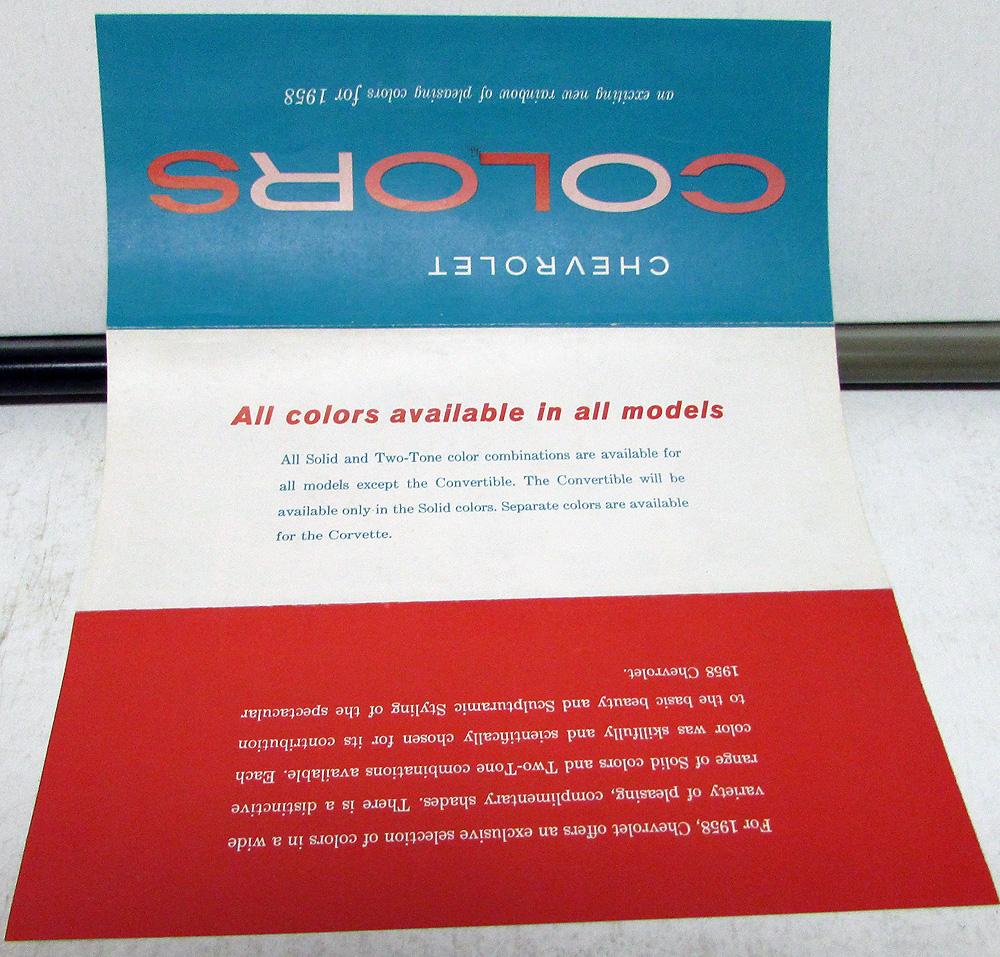Original 1958 Chevrolet Dealer Sales Brochure. This rare Color Options Brochure shows the Two-Tone and Solid Colors that were available on Chevy Passenger Cars. It also shows the Color Options for Corvettes. It is in very good condition with minor wear and soiling [see photos].