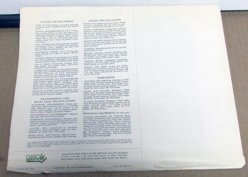 Original 1958 Edsel by Ford color, sales folder that opens to a wonderful display of the full line of Edsel models. Opened measures 24 x 48.25 inches. One side with a display of the models. One side with information/illustrations of the chassis, powerteams, features and specifications. Models include: Citation, Corsair, Pacer, Ranger, and station wagons Bremuda and Roundup. Two sided printing on one sheet of paper with multiple folds. Good condition for its age with minor blemishing and soiling [see photos]. Bottom edge of Brochure is folded up and has some damage.