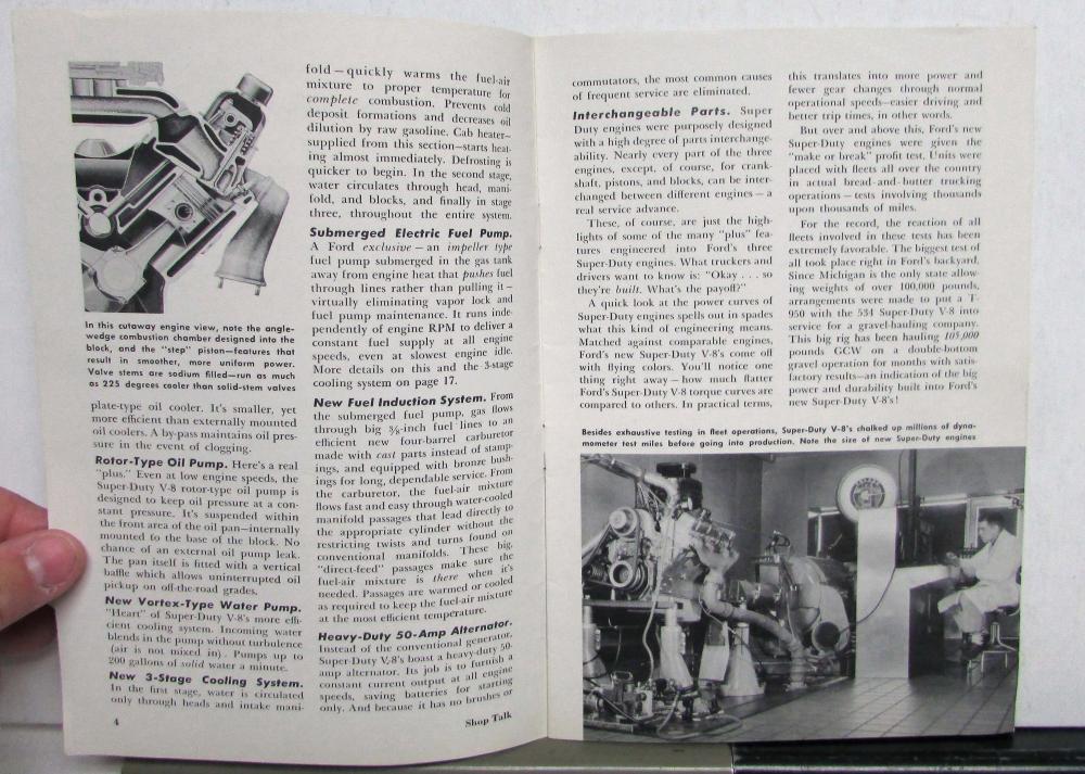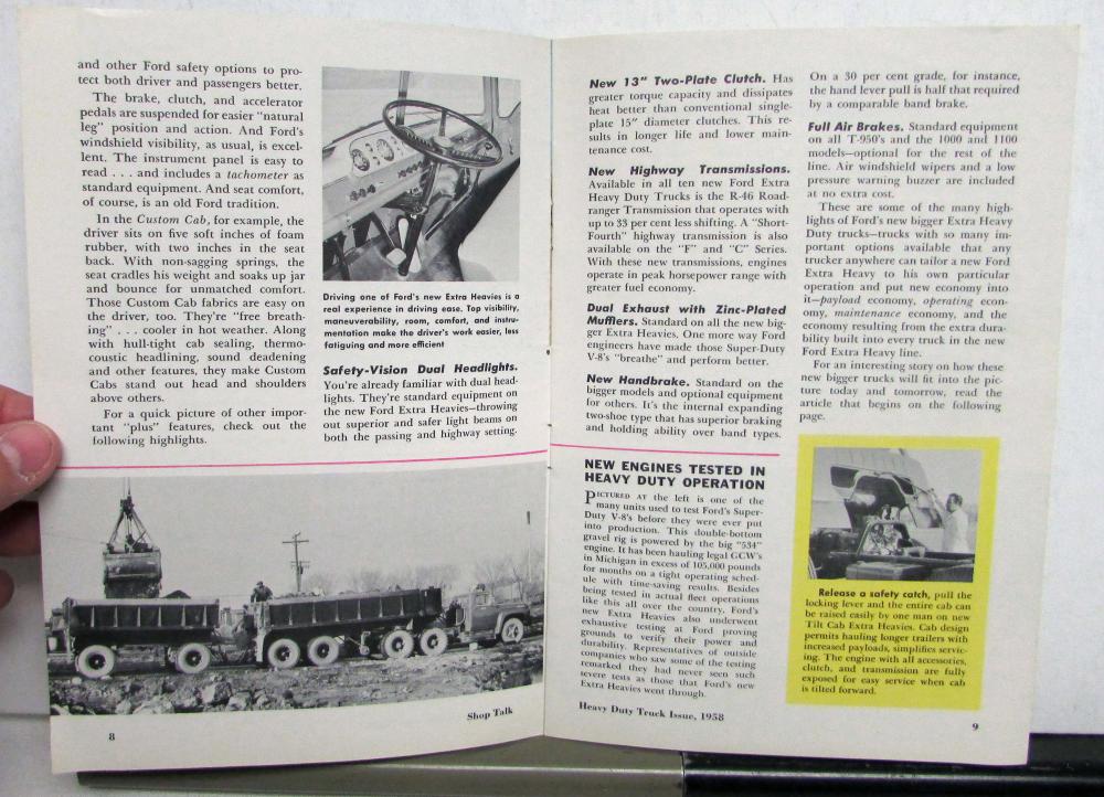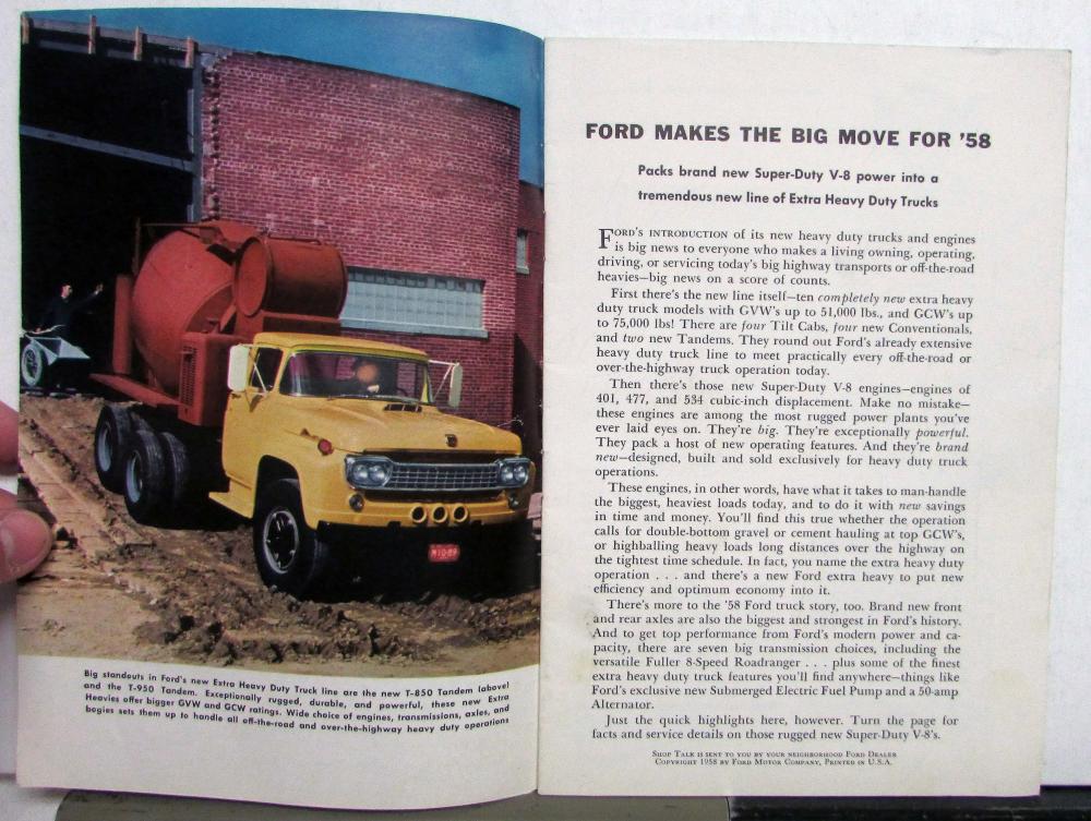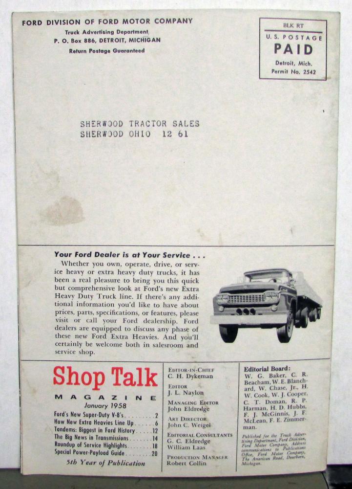 This is an original 1958 Shop Talk magazine for the Heavy Duty Trucks that came out in January of '58. It is in good condition but does have some minor signs of wear, see photos for reference. This magazine has very nice photos throughout the magazine as it talks about the new line, the changes Ford had made, service highlights, and much more!
