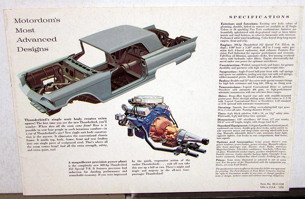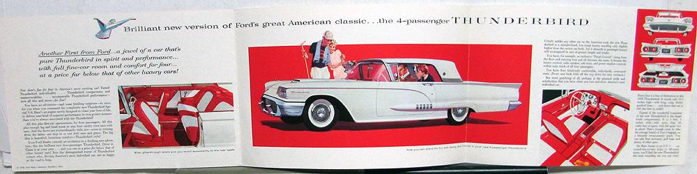 Original 1958 Ford Thunderbird Dealer Sales Brochure. This Folder highlights the new 4 Passenger Car from Ford. It is in good condition with minor wear and discoloration [see photos]. Revised, Dated 1/58