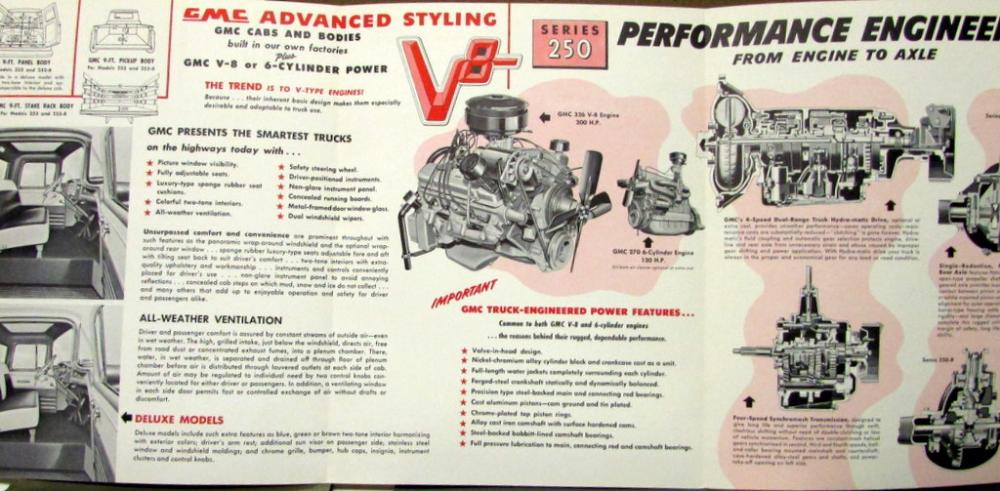 Original, 1958, GMC truck 250 and 250-8 series (pickup, stake, panel), color, sales brochure/folder. Read about performance and features. Includes illustrations & photos, dimensions, and standard chassis specifications.