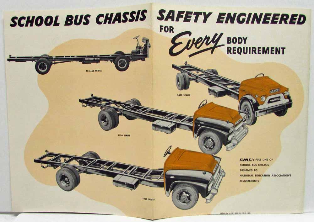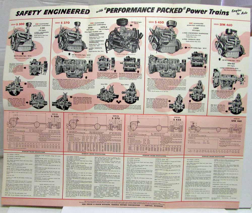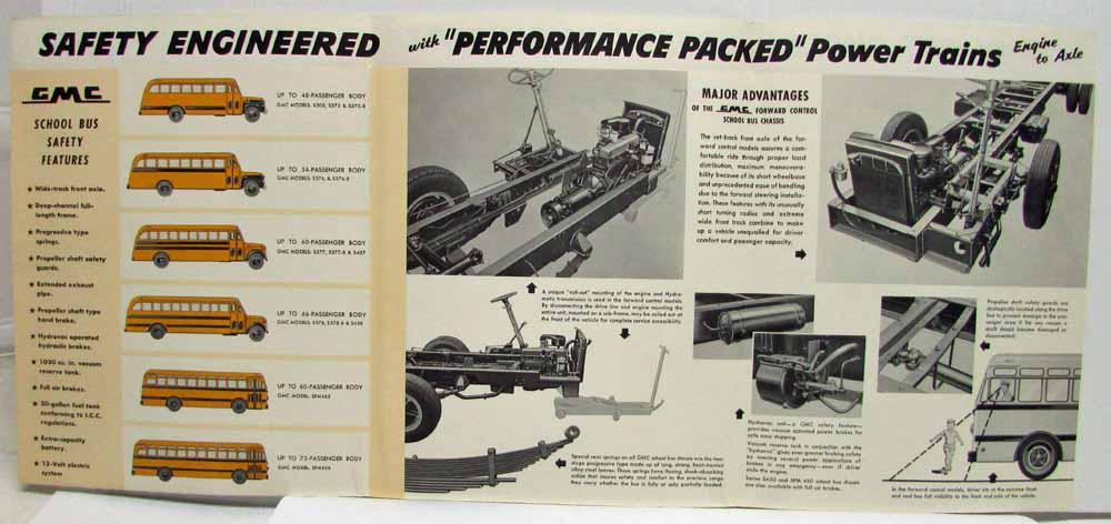 1958 GMC Trucks School Bus Chassis S300 S370 S370-8 S450 SFM460 Sales Folder. Safety engineered with performance packed power trains engine to axle. Highlights school bus safety features. Makes the case for GMC forward contorl models. Shows series engine availability and specifications. Images depict the models. Condition: Dealer stamp. Some wrinkling at folds. See pics.