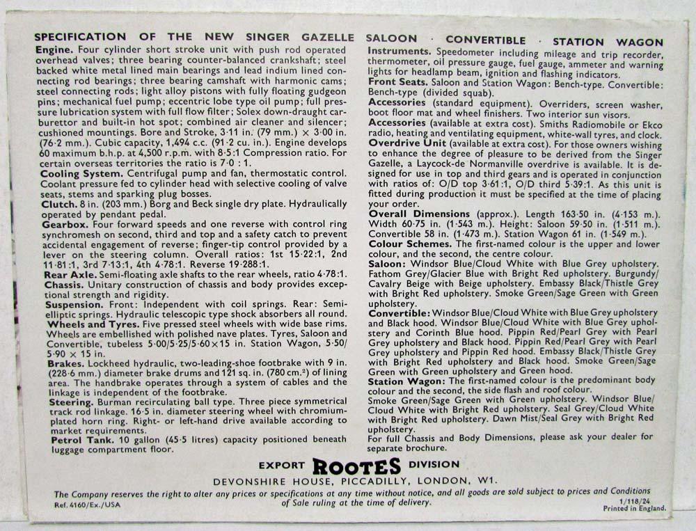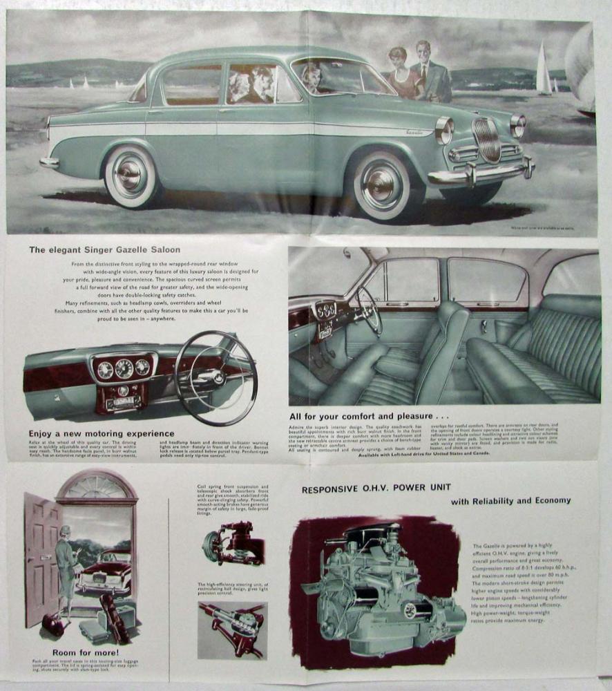 1959 1960 Singer Gazelle Sales Folder. Saloon. Convertible. Station Wagon. For USA market. ORIGINAL
